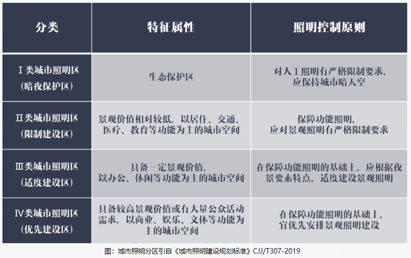 《標(biāo)準(zhǔn)》要求進(jìn)行“四區(qū)劃定”(即劃定暗夜保護(hù)區(qū)、限制建設(shè)區(qū)、適度建設(shè)區(qū)及優(yōu)先建設(shè)區(qū)),以落實(shí)城市夜間的生態(tài)保護(hù),并有效控制城市照明的建設(shè)規(guī)模和建設(shè)強(qiáng)度,避免過度建設(shè)引發(fā)城市生態(tài)事故,干擾公眾夜間正常生活,增加城市能源消耗,加重政府財(cái)政負(fù)擔(dān)。