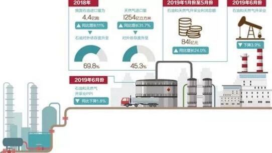 中國石油集團經(jīng)濟技術(shù)研究院發(fā)布的《2018年國內(nèi)外油氣行業(yè)發(fā)展報告》顯示,2018年我國石油進口量為4.4億噸,同比增長11%,石油對外依存度升至69.8%;天然氣進口量1254億立方米,同比增長31.7%,對外依存度升至45.3%。